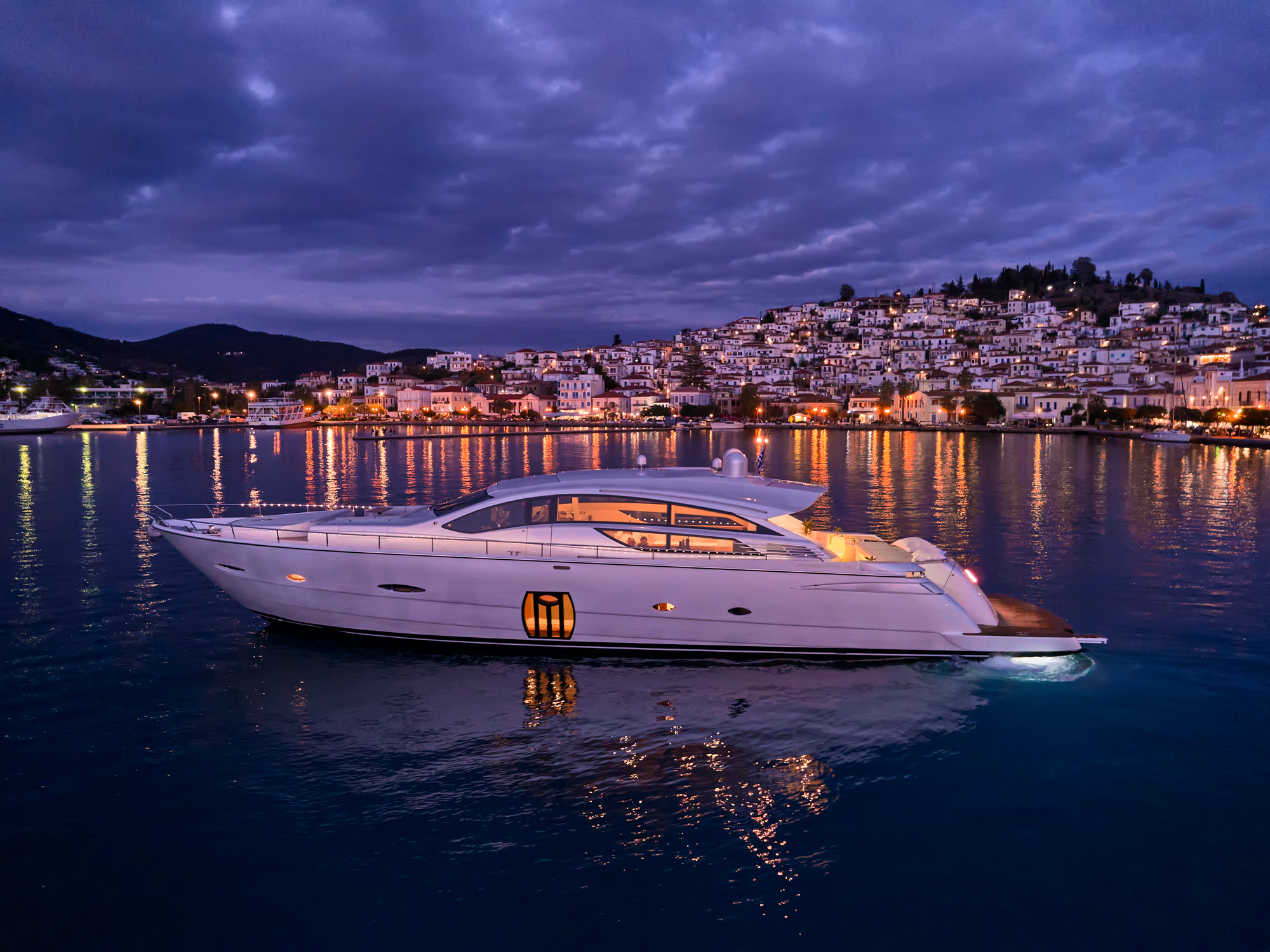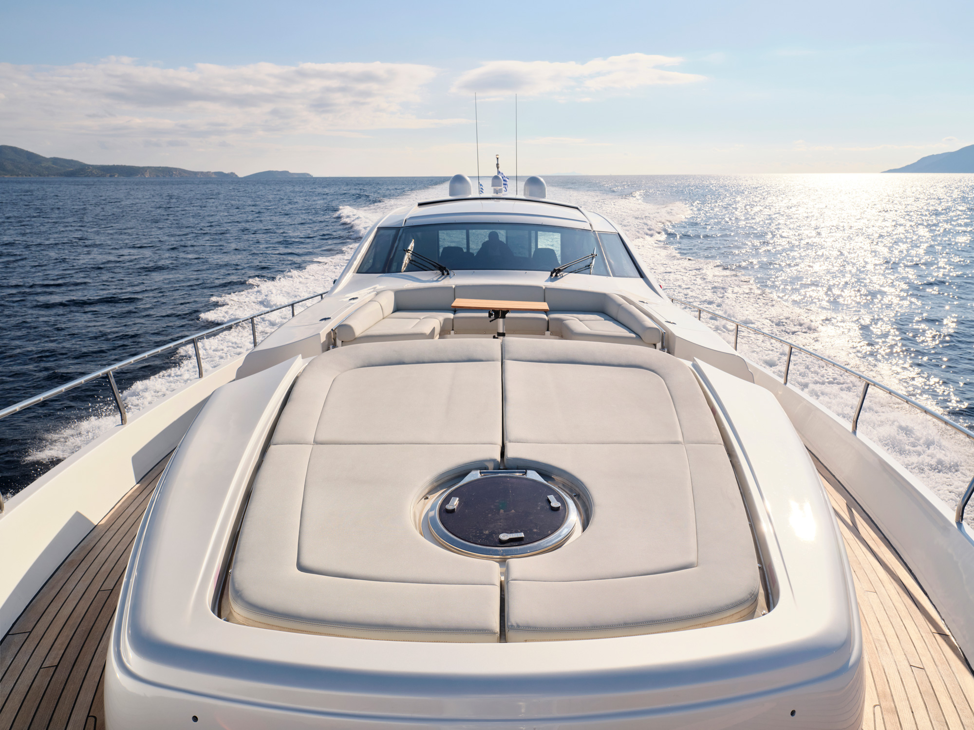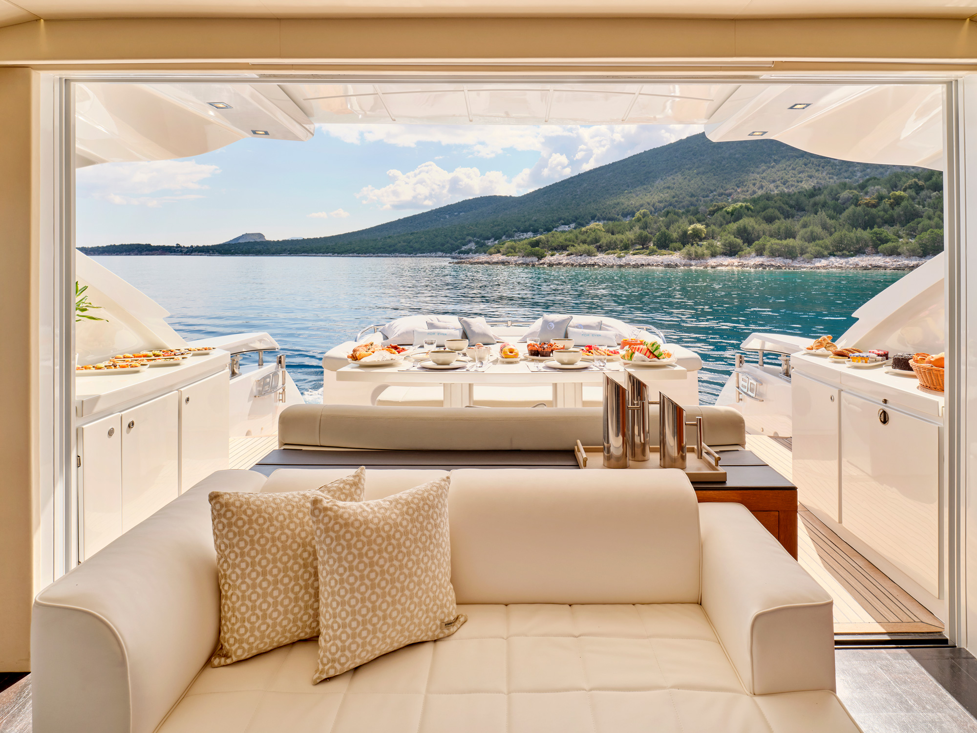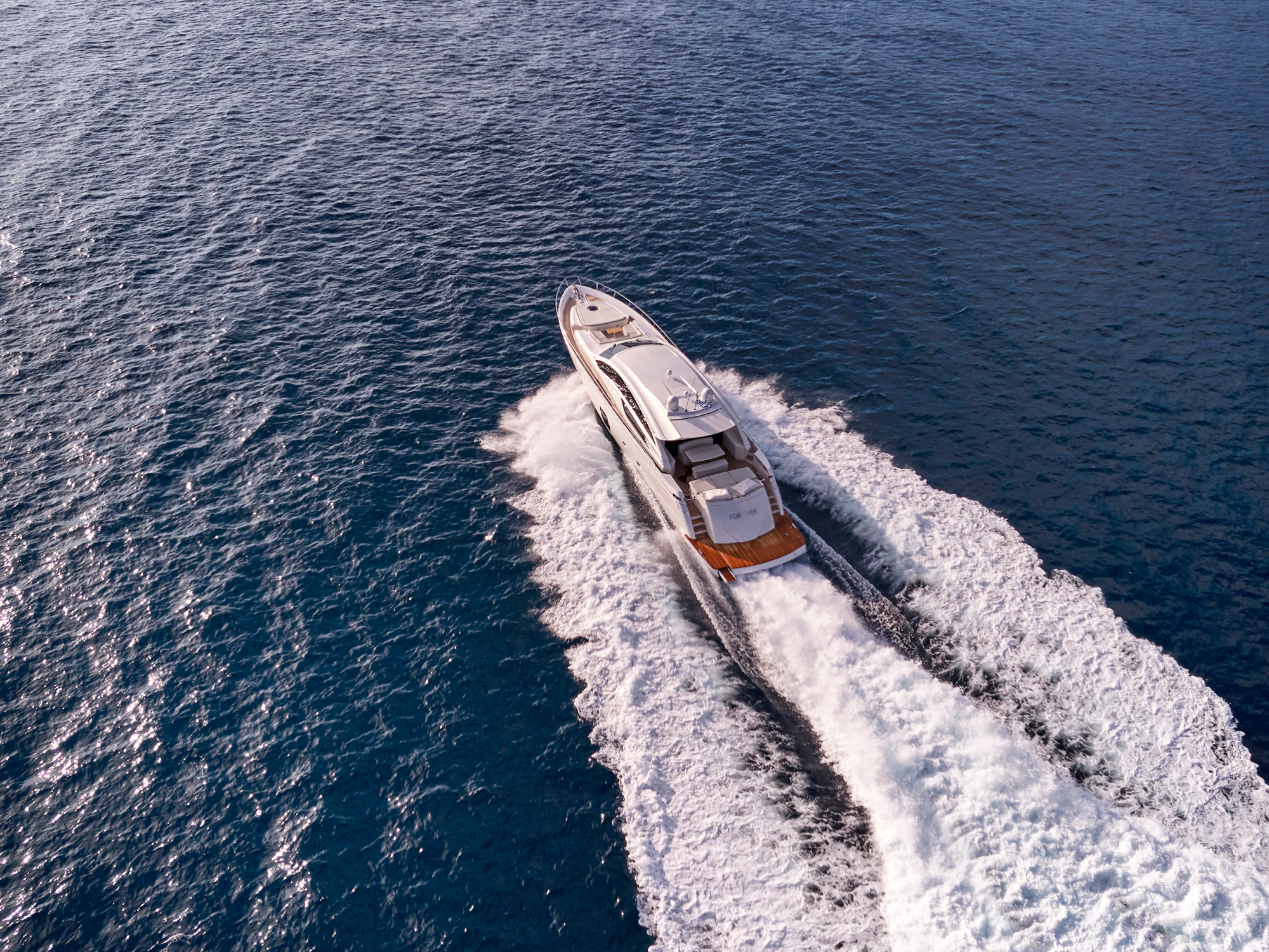 For Ever is a Pershing 80 Open model built in 2008 and last refitted in 2023 (overall exterior painting from present color to white pearl color)! She has been designed to comfortably accommodate up to eight guests in four cozy cabins - one Master, one VIP and two Twin cabins. Built with a GRP hull and GRP superstructure, consumes transit fuel, she has impressive speed and great efficiency thanks to her planing hull. Powered by two diesel MTU (16V 2000 M93) 2.400hp engines, she comfortably cruises at 33 knots, and reaches a maximum speed of 48 knots with a range of up to 330 nautical miles. Her low draft of 1.40m/4' 8" makes her primed for accessing shallow areas and cruising close to the shorelines. The main deck has large, comfortable exterior areas where guests can relax towards the bow and the stern. The bow area has a bimini sun top, and the cockpit an extendable roof providing more or less shade. The salon area is very comfortable and the doors between the cockpit and the salon can be hidden away to open up these areas completely. Four experienced and professional crew members will ensure a relaxed luxury yacht experience!
